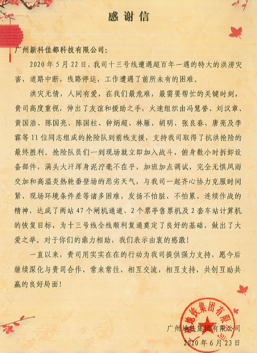 参与抢险的米兰milan科技全资子公司新科佳都和华之源被授予感谢信